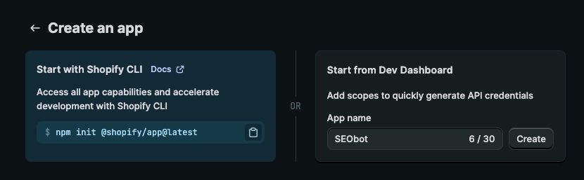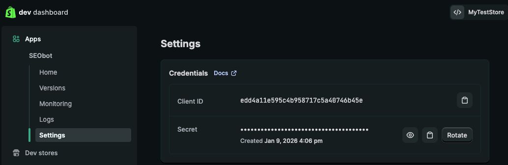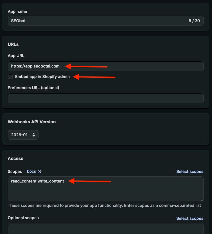 The App URL must be https://app.seobotai.com, uncheck the Embed app in Shopify admin, and specify Scopes: read_content,write_content