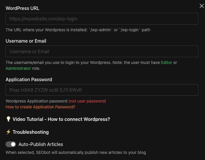 - Application Password: WordPress Application password (not user password). How to create an Application Password?